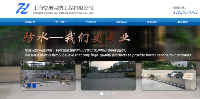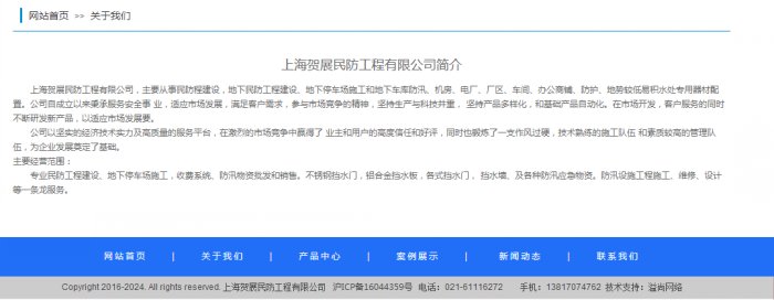 上海賀展民防工程有限公司,主要從事民防程建設,地下民防工程建設、地下停車場施工和地下車庫防汛、機房、電廠、廠區、車間、辦公商鋪、防護、地勢較低易積水處專用器材配置。公司自成立以來秉承服務安全事 業,適應市場發展,滿足客戶需求,參與市場競爭的精神,堅持生產與科技并重, 堅持產品多樣化,和基礎產品自動化。在市場開發,客戶服務的同時不斷研發新產品,以適應市場發展需要。