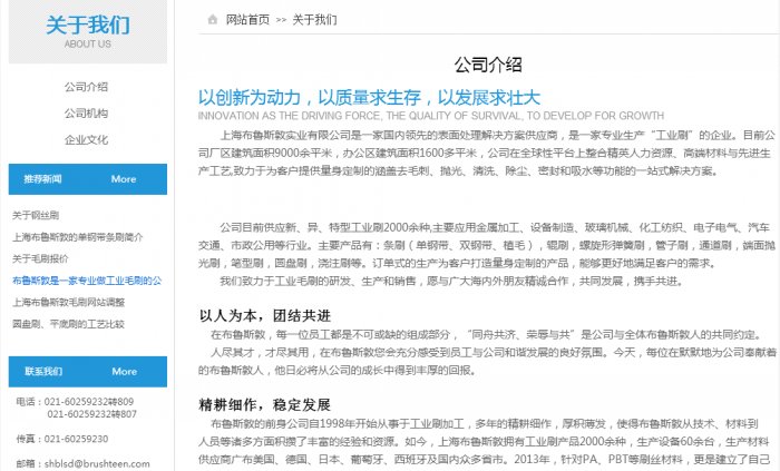 上海布魯斯敦實(shí)業(yè)有限公司是一家國(guó)內(nèi)領(lǐng)先的表面處理解決方案供應(yīng)商,是一家專業(yè)生產(chǎn)“工業(yè)刷”的企業(yè)。目前公司廠區(qū)建筑面積9000余平米,辦公區(qū)建筑面積1600多平米,公司在全球性平臺(tái)上整合精英人力資源、高端材料與先進(jìn)生產(chǎn)工藝,致力于為客戶提供量身定制的涵蓋去毛刺、拋光、清洗、除塵、密封和吸水等功能的一站式解決方案。公司目前供應(yīng)新、異、特型工業(yè)刷2000余種,主要應(yīng)用金屬加工、設(shè)備制造、玻璃機(jī)械、化工紡織、電子電氣、汽車交通、市政公用等行業(yè)。主要產(chǎn)品有:條刷(單鋼帶、雙鋼帶、植毛),輥刷,螺旋形彈簧刷,管子刷,通道刷,端面拋光刷,筆型刷,圓盤刷,澆注刷等。訂單式的生產(chǎn)為客戶打造量身定制的產(chǎn)品,能夠更好地滿足客戶的需求。