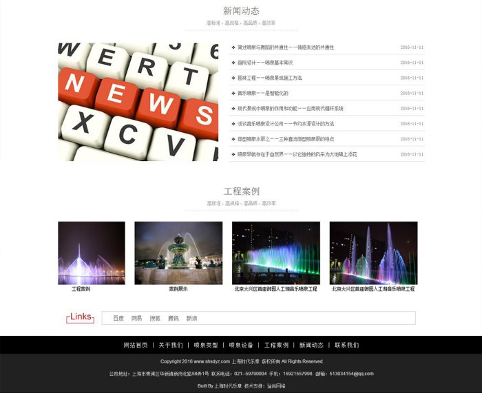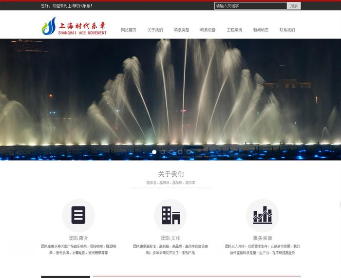 網站描述:首頁采用企業型網站排版方式,以簡潔化排版方式,突顯公司實力,以實際案例展示,表明公司業務范圍。首頁包含版塊有關于我們版塊,產品中心版塊,噴泉知識版塊,噴泉設備版塊,新聞動態版塊,工程案例版塊。