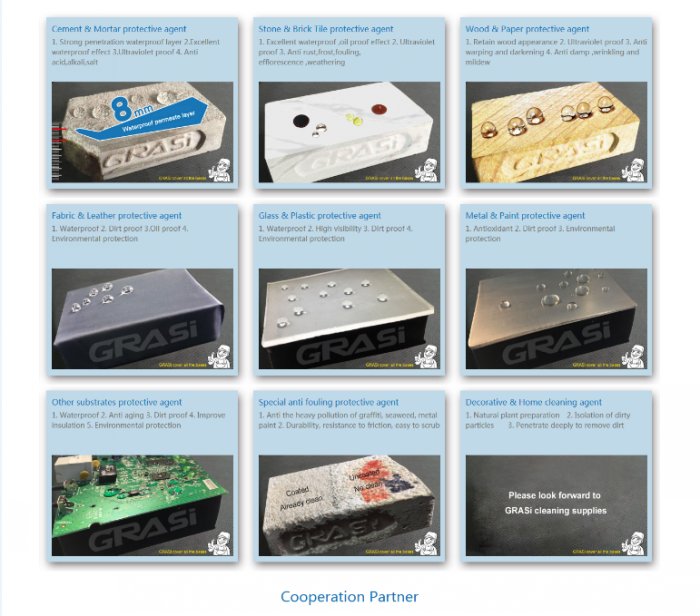 In 2002, GRASi industry co.,ltd was established in shanghai . Using high-tech nano technology to develop GRASi series various types of functional waterproof,anti-corrosion,stain proof nano protective agent in cement, stone, wood, metal, fabric, leather and other professional fields. GRASi aims to be the worlds best nano waterproof protective material professional factory .Through the unremitting efforts, in nano waterproof agent industry, GRASi won wide popularity and reputation, GRASi products used in many world influential architecture ,like the Coca Cola factory...