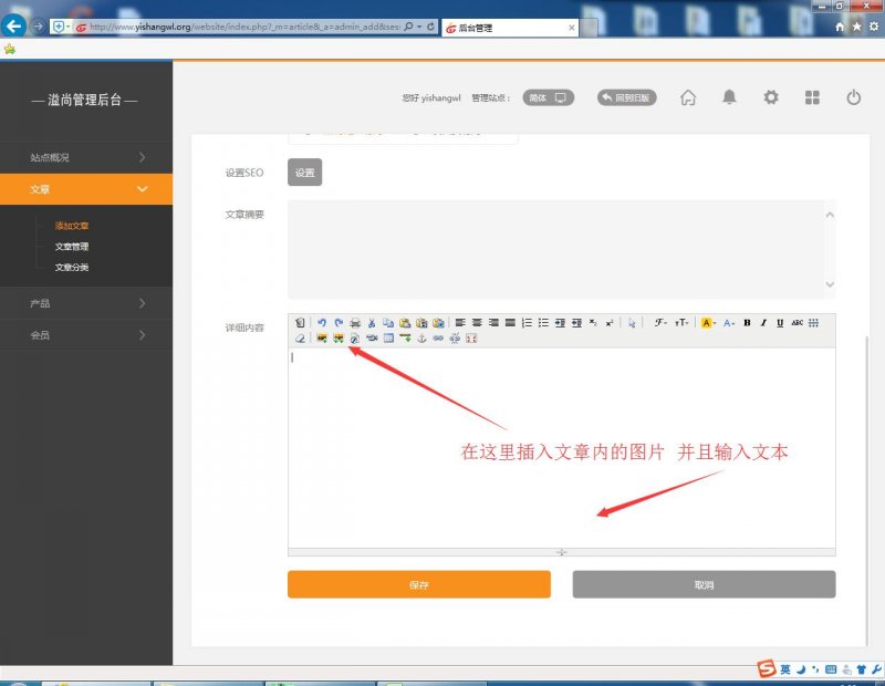 3.選擇您需要添加、修改、刪除的內(nèi)容 區(qū)域(產(chǎn)品、文章), 在網(wǎng)站后臺(tái)初始界面點(diǎn)擊“文章”,然后選擇“添加文章”即可進(jìn)入新聞添加界面(如下圖)