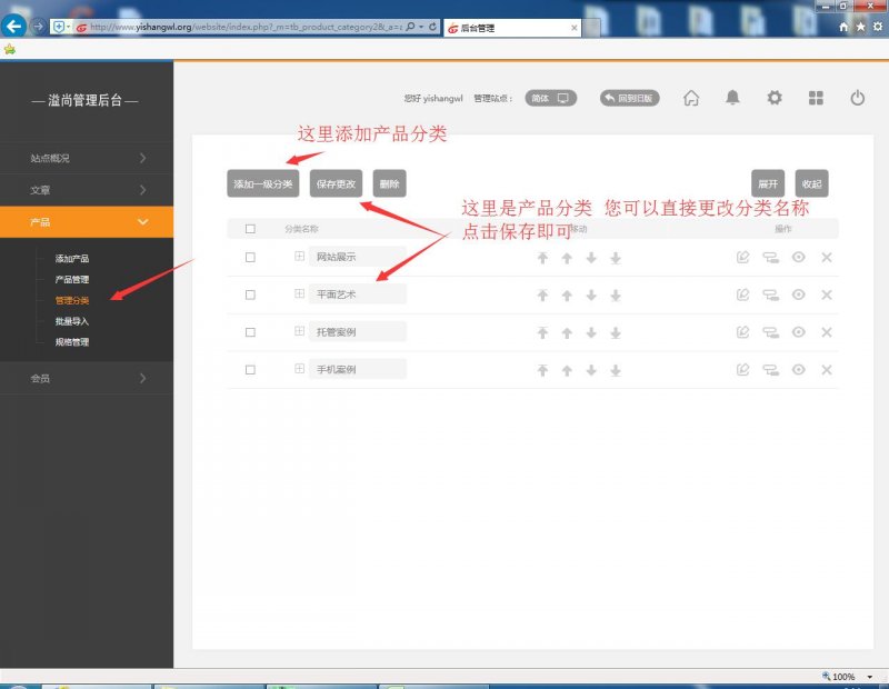 7. 修改分類(lèi)添加分類(lèi):點(diǎn)擊管理分類(lèi),可以添加產(chǎn)品分類(lèi),也可以修改產(chǎn)品分類(lèi)