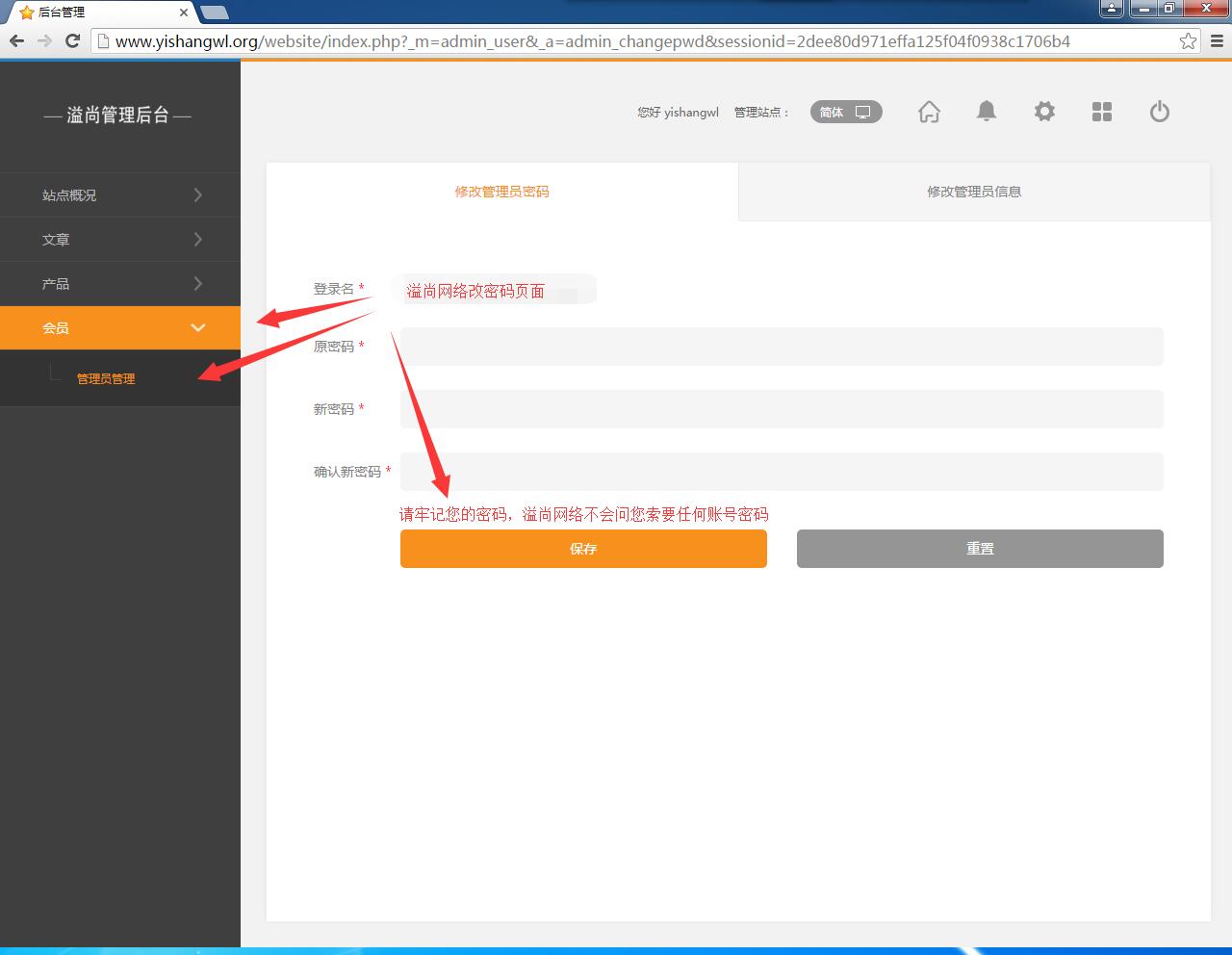 3.當(dāng)您第一次拿到后臺(tái)賬號(hào)密碼的時(shí)候,記得更改密碼以便保證您的網(wǎng)站后臺(tái)資料的安全以及保密度。溢尚網(wǎng)絡(luò)全體員工不會(huì)詢(xún)問(wèn)您索要賬號(hào)以及密碼。